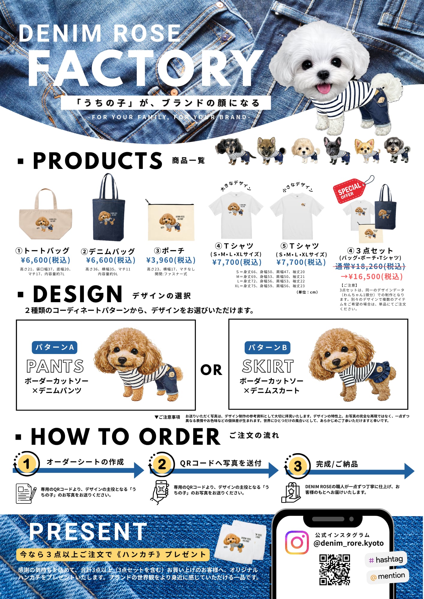 ※アートご注文のお客様は《アートのみ》のご決済をお願いいたします。 DENIM ROSE FACTORY。 テーマは【「うちの子」が、ブランドの顔になる】。 大切な家族である「うちの子」が、 ブランドのモデルになったら…! そんな夢を形にする、 新しいプリントサービスが誕生しました。 ============================== ■ 商品詳細 《①トートバッグ》 [サイズ(約)] 縦21cm、袋口幅37cm、底幅20cm、 マチ17cm、内容量約7L 《②デニムバッグ》 [サイズ(約)] 縦36cm、横35cm、マチ11cm、 内容量約9L こちらは《ポーチ》です。 [サイズ(約)] 縦23cm、横17cm、マチなし、 開閉:ファスナー式 《④Tシャツ(デザイン大/中央)》 [男女兼用サイズ(約)] Sサイズ=身丈66cm、身幅50cm、肩幅47cm、袖丈20cm Mサイズ=身丈69cm、身幅53cm、肩幅50cm、袖丈21cm Lサイズ=身丈72cm、身幅56cm、肩幅53cm、袖丈22cm XLサイズ=身丈75cm、身幅59cm、肩幅53cm、袖丈23cm 《⑤Tシャツ(デザイン小/胸元)》 [男女兼用サイズ(約)] Sサイズ=身丈66cm、身幅50cm、肩幅47cm、袖丈20cm Mサイズ=身丈69cm、身幅53cm、肩幅50cm、袖丈21cm Lサイズ=身丈72cm、身幅56cm、肩幅53cm、袖丈22cm LLサイズ=身丈75cm、身幅59cm、肩幅53cm、袖丈23cm ============================== ■ 魅力を引き立てる2つのコーディネート お送りいただいたお写真をもとに、アパレルブランドらしい2つのスタイルからお選びいただけます。 ・パターンA:カジュアルで軽快な「デニムパンツ」スタイル ・パターンB:華やかで可愛らしい「デニムスカート」スタイル ============================== ■ご注文の流れ 1.ネットショップにてご注文お手続き完了 2.公式メールアドレス【[email protected]】に お名前・わんちゃんのお名前・写真を送付 □ お顔がはっきりわかる写真(1枚) □ お体全体がわかる写真(1枚) ※複数頭(多頭)でのご注文をいただく際は、どのお写真がどの子か、お手数ですがメッセージにてお知らせください。 3.制作・ご納品 お写真確認後、 約2週間以内でご発送させていただきます。 ============================== ■新サービス記念キャンペーン 3点セット、もしくは単品を自由に3点以上お選びいただいた方全員に、ハンカチをプレゼントさせていただきます。 ============================== ■ 注意事項•同意欄 ・本サービスは、AI画像生成と職人技を融合した独自のアート制作です。 ・ご提供いただいたお写真はデザイン制作の参考資料として使用いたします。 ・デザインの特性上、お写真の完全な再現ではなく、1点ずつ異なる表情やお色味などの個体差が生まれます。世界にひとつだけの風合いとして、予めご了承ください。 ・オーダー作品のため、受注後のキャンセル・ご返金はいたしかねます。 ・取得した個人情報は、必要なご連絡、及びサービス提供の目的に利用いたします。 ・個人情報は法令で認められる場合を除き、第三者へ提供することはありません。