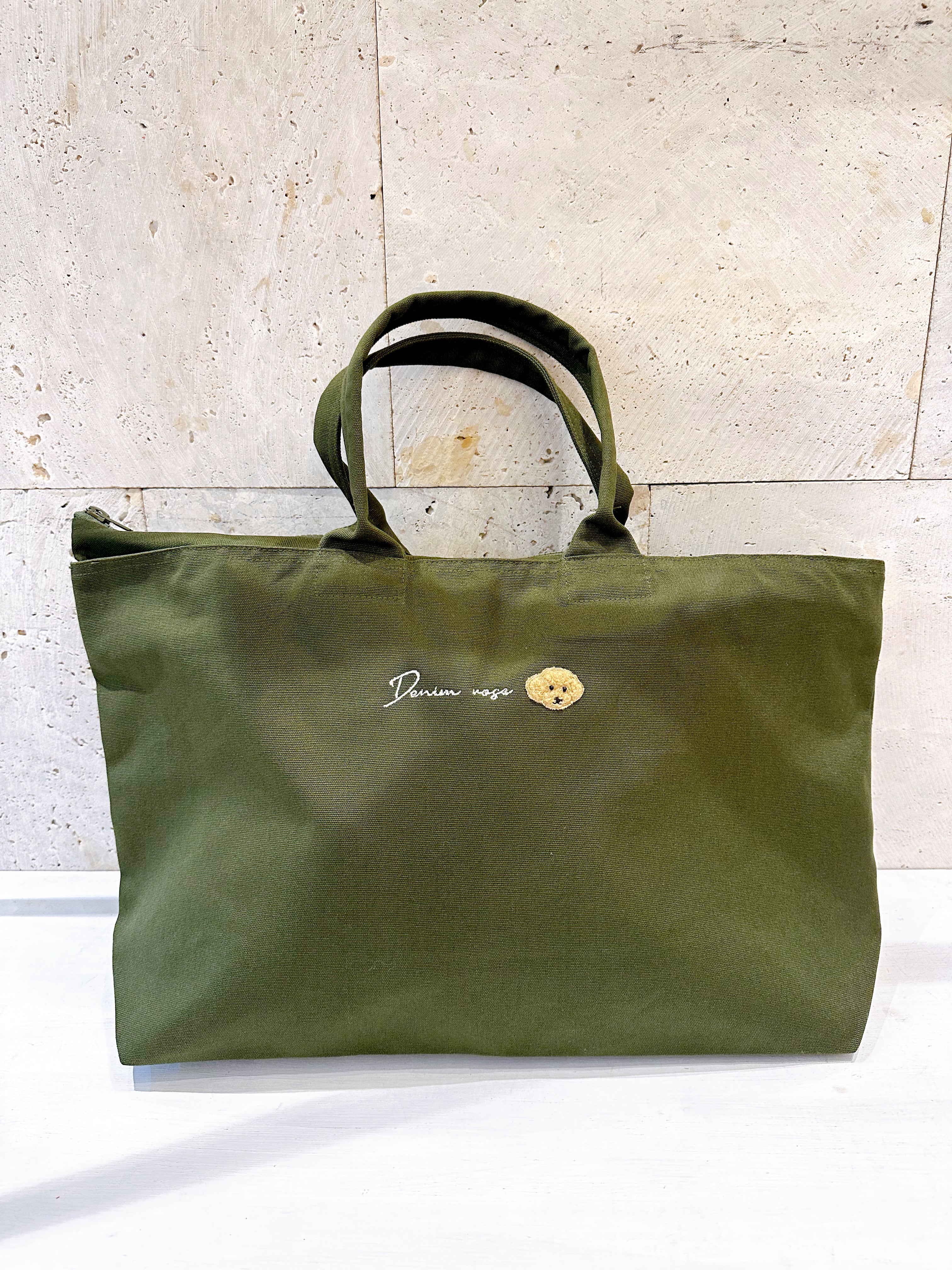 ヒッコリーストライプのデニムバッグにオリジナルDENIM ROSEロゴ刺繍とかわいいワッペンが施されています。袋口はファスナー式になっており、ポケットは内側に1個ついております。
