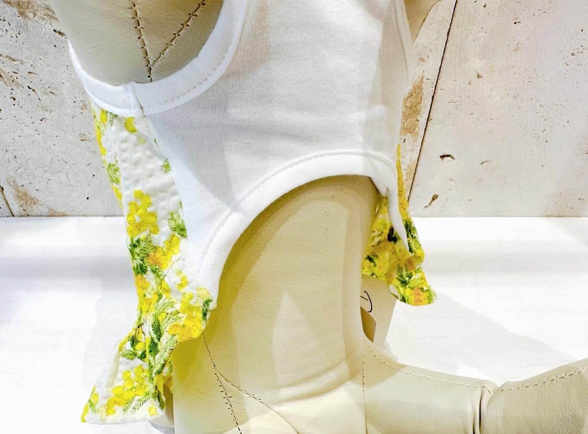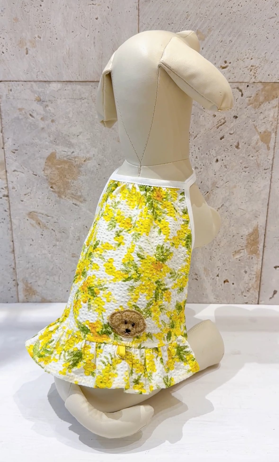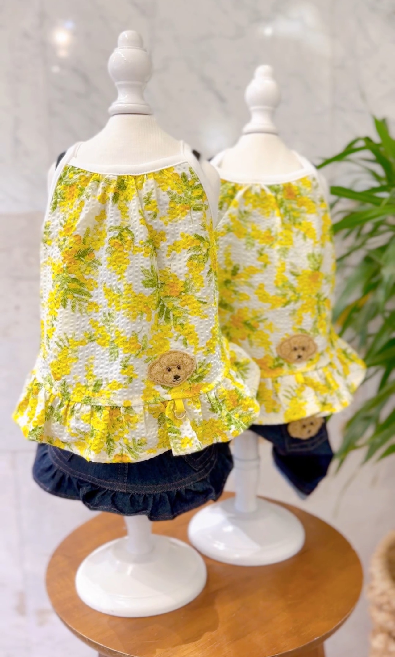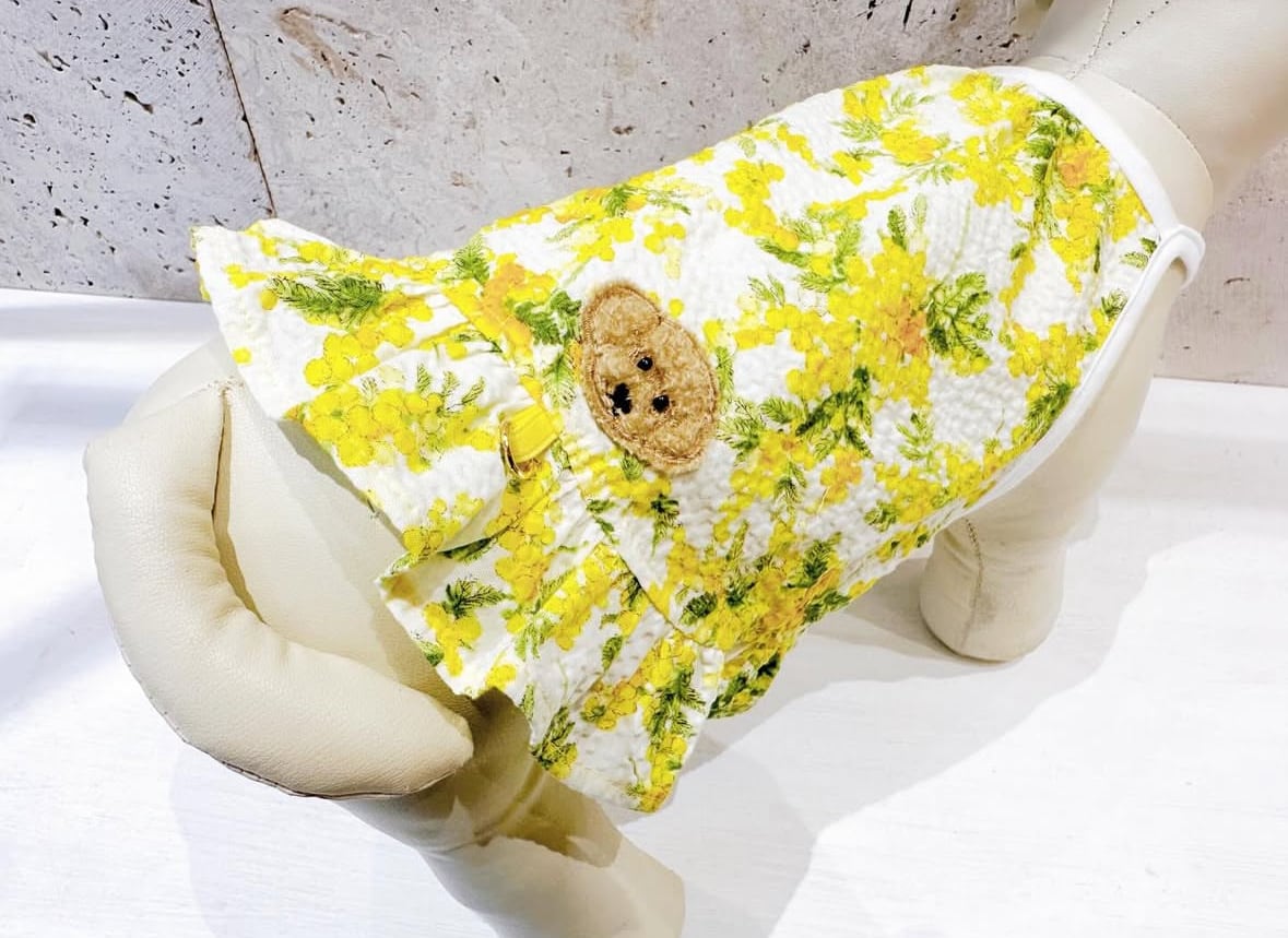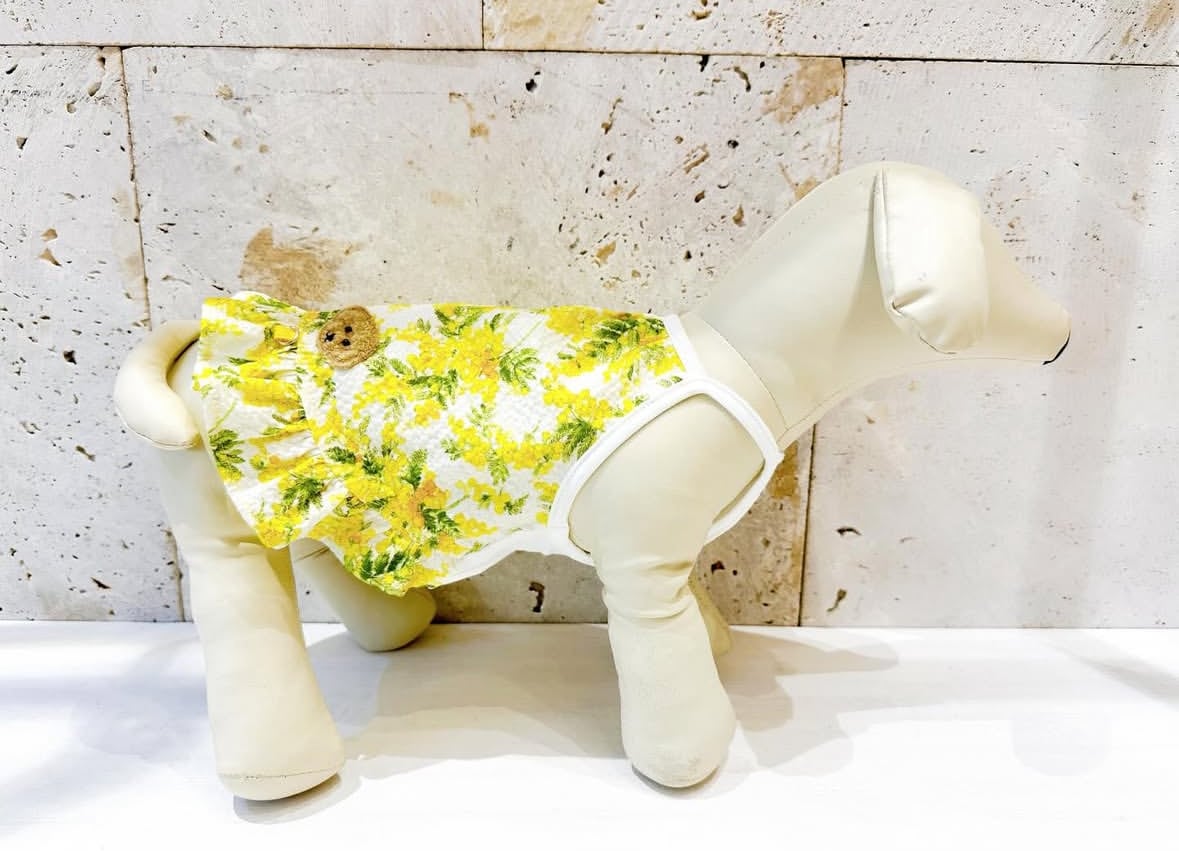こちらは爽やかで可愛いミモザ柄生地を使用しております。裾のフリルがとっても可愛いシルエットのお洋服です。