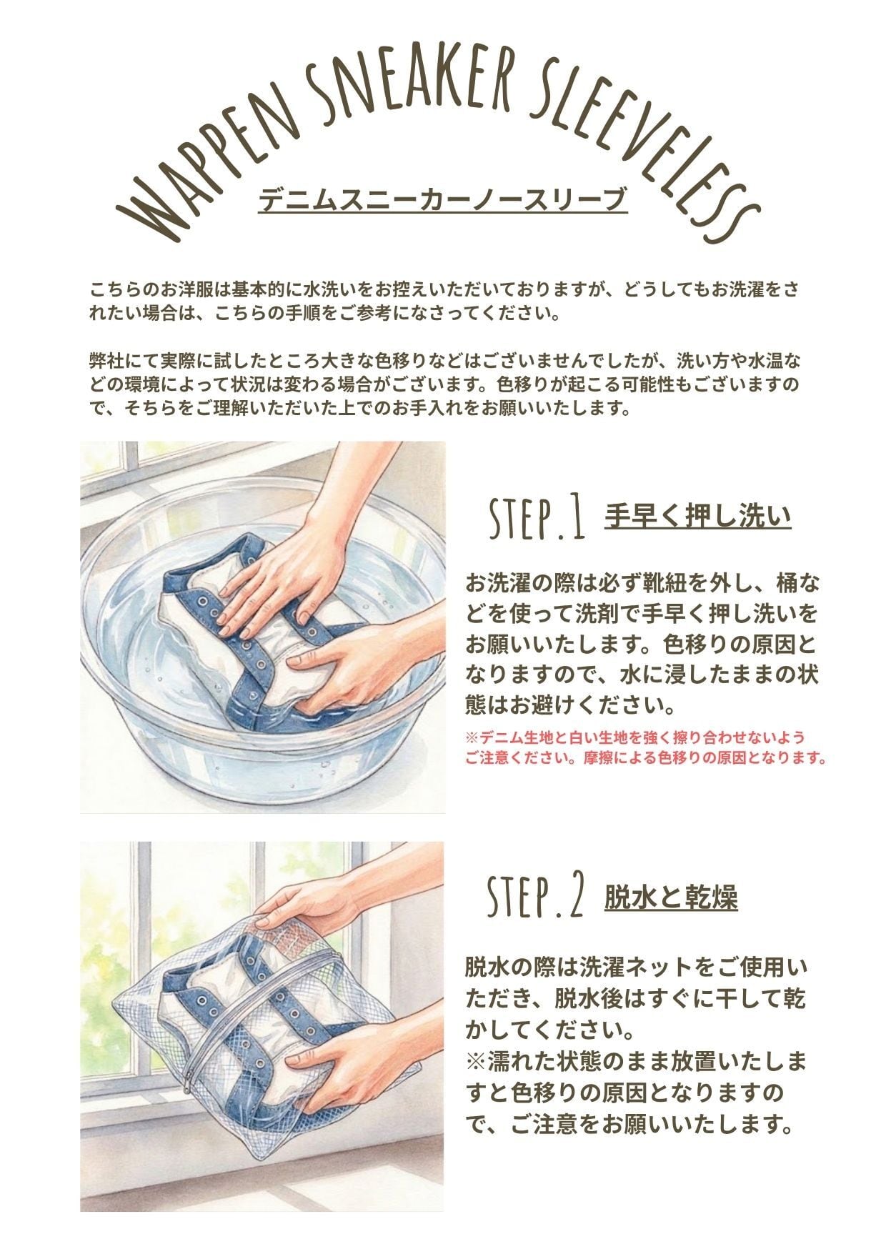 水洗いによって、デニム生地から白い生地へ色移りしてしまう恐れがございます。