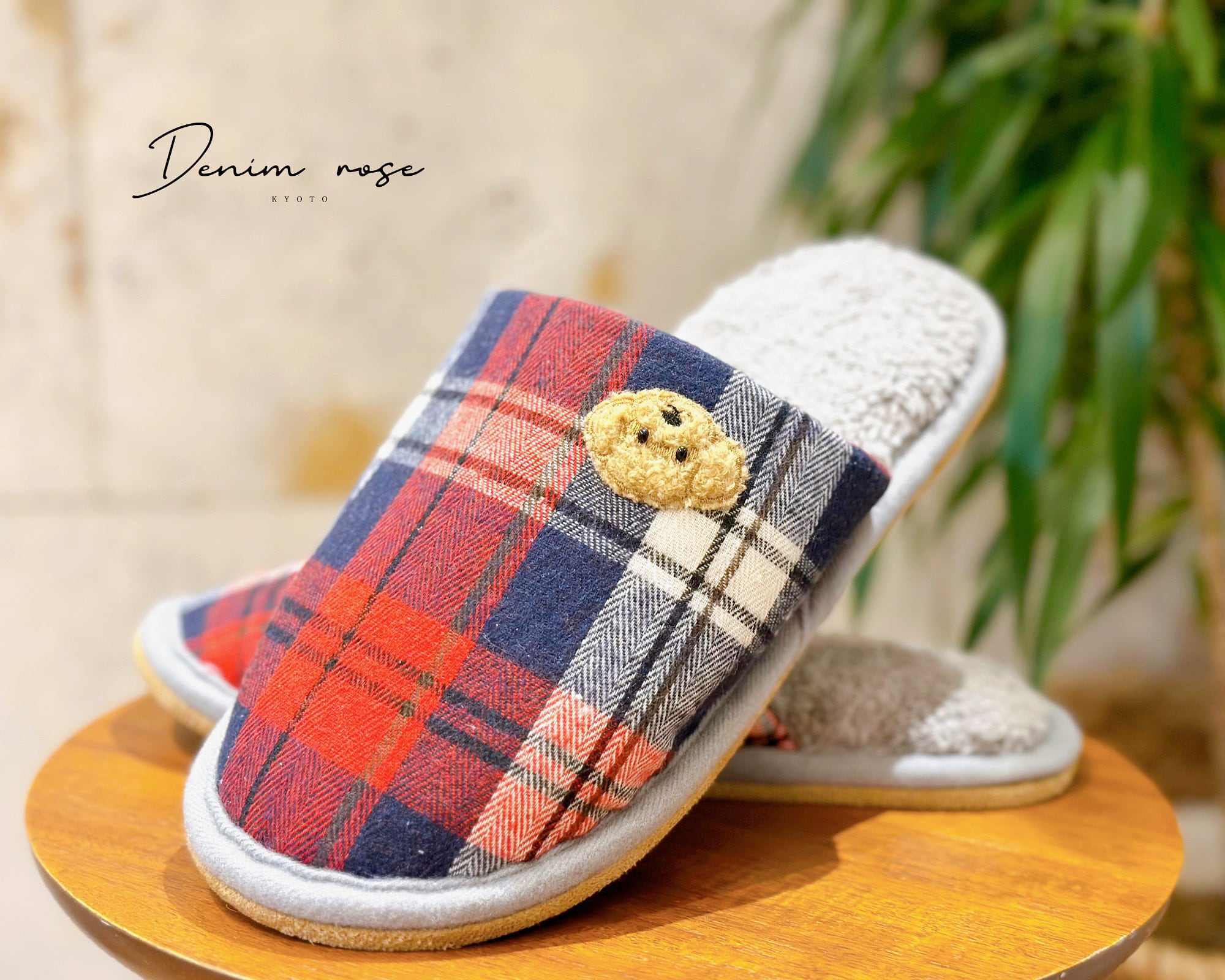 ワッペンチェックスリッパ。スリッパにオリジナルかわいいワッペンが施されています。