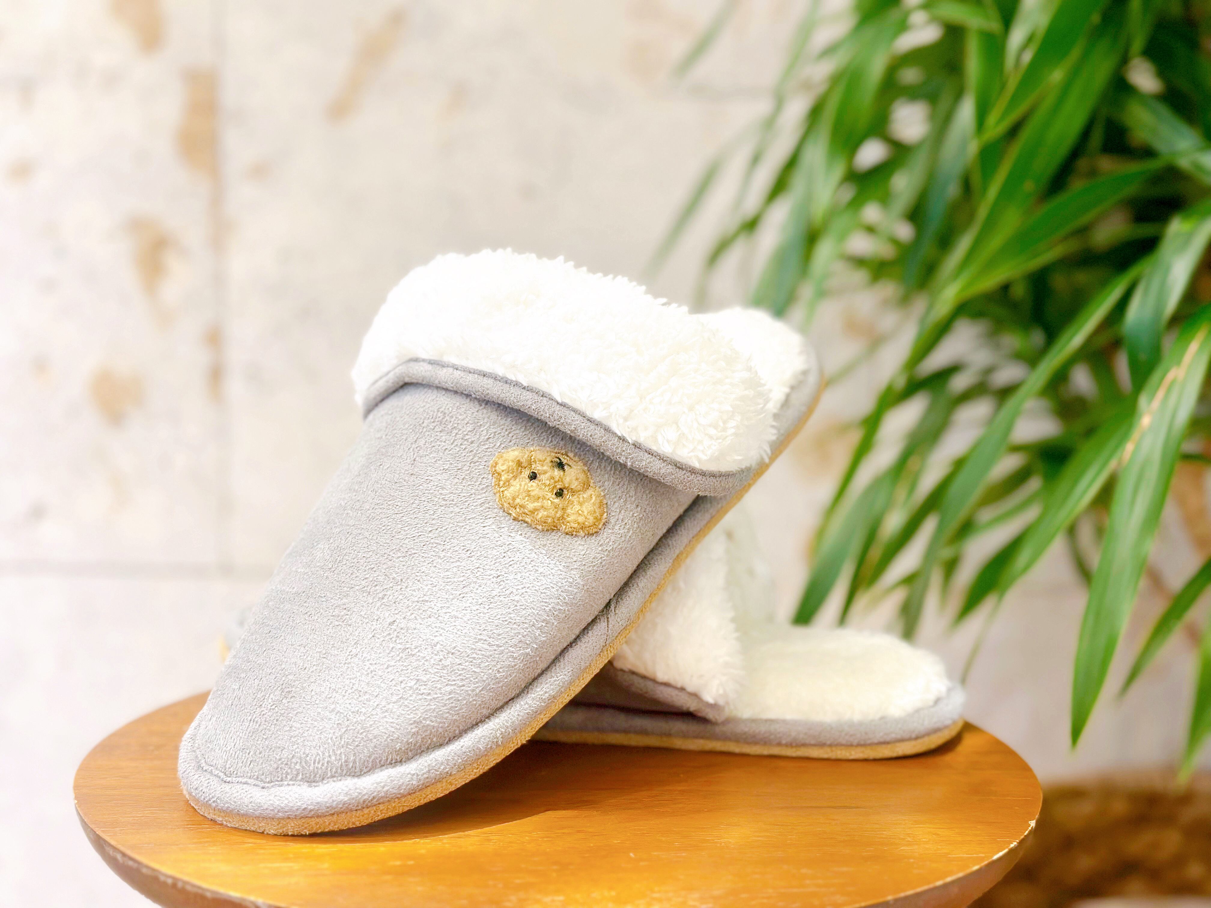 ワッペンモコモコボアスリッパ。スリッパにオリジナルかわいいワッペンが施されています。